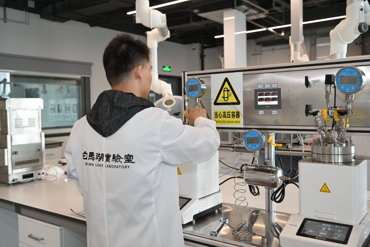 二氧化碳捕集及利用團隊的科研人員正在進行實驗。 白馬湖實驗室 提供