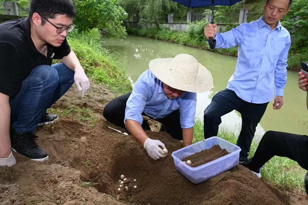在灘坑水電站水生生物增殖放流站親黿培育池旁的土坡上,增殖放流站站長葉承義正在珠江水產研究所所長朱新平的遠程指導下,對黿卵進行操作。“我們不能亂挖一氣,濕潤的沙土中往往埋藏著黿卵,挖的時候動作必須要輕柔。”葉承義用手將產卵周邊的沙土一點點撥開。