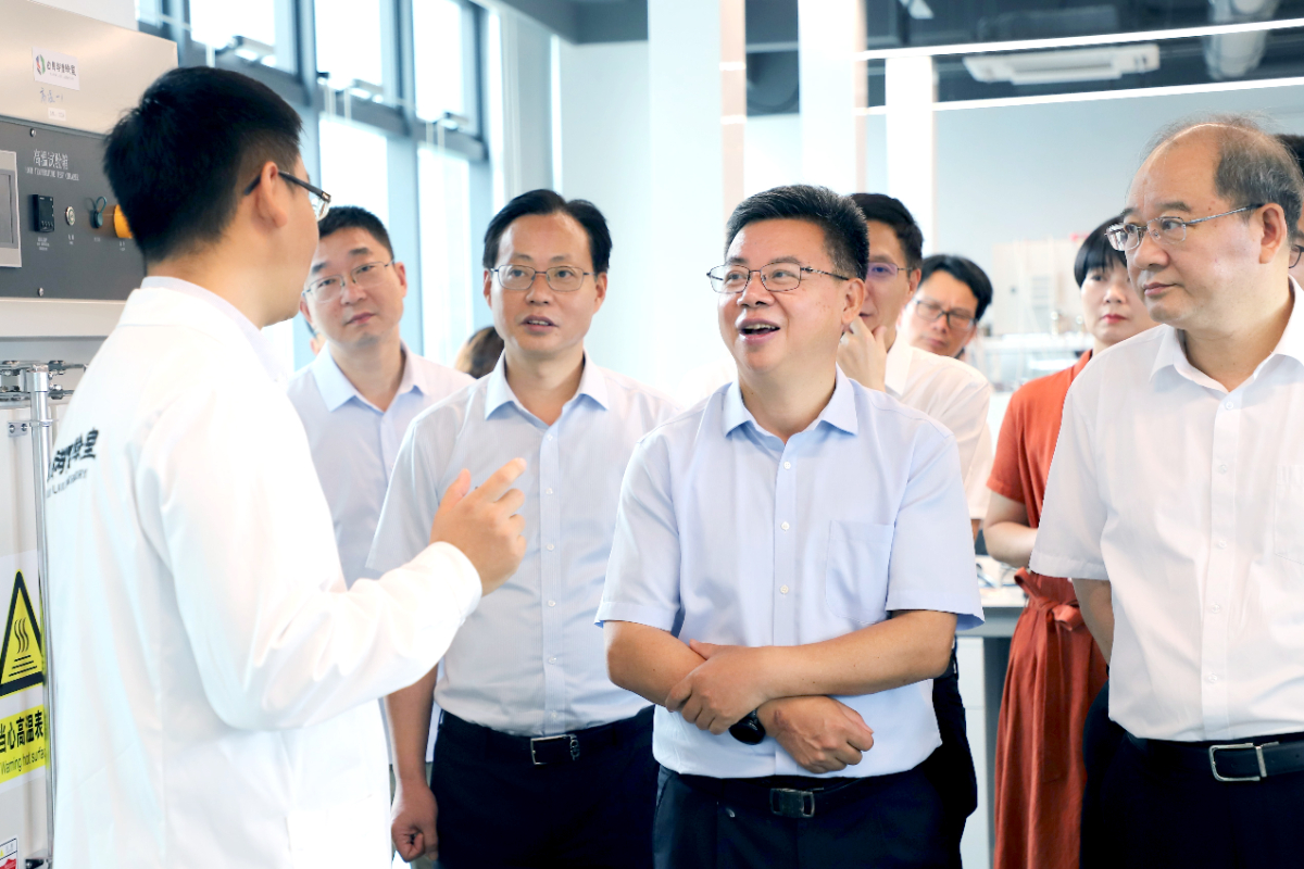 暨軍民一行首先了解實驗室發展歷程,并通過源創之門走進展廳,進一步了解實驗室組織架構、人才力量、科研成果。白馬湖實驗室落地兩年多來,瞄準世界能源科技發展前沿,立足浙江產業需求,聚焦綠色能源的能質轉化與傳遞,著力破解能源領域重大科學與技術問題。暨軍民一行與實驗室相關負責人親切交流,對能源領域取得的科研成績表示充分肯定,并鼓勵科研團隊在關鍵核心技術的攻關路上繼續勇攀高峰,在突破“卡脖子”關鍵核心技術上下功夫。固態電池實驗室今年3月進駐,一行人專程走進實驗室,聽取項目前期成果,并在成果展示臺前駐足交流。暨軍民表示,政府相關部門要加大支持力度,推動更多科技成果實現轉化。