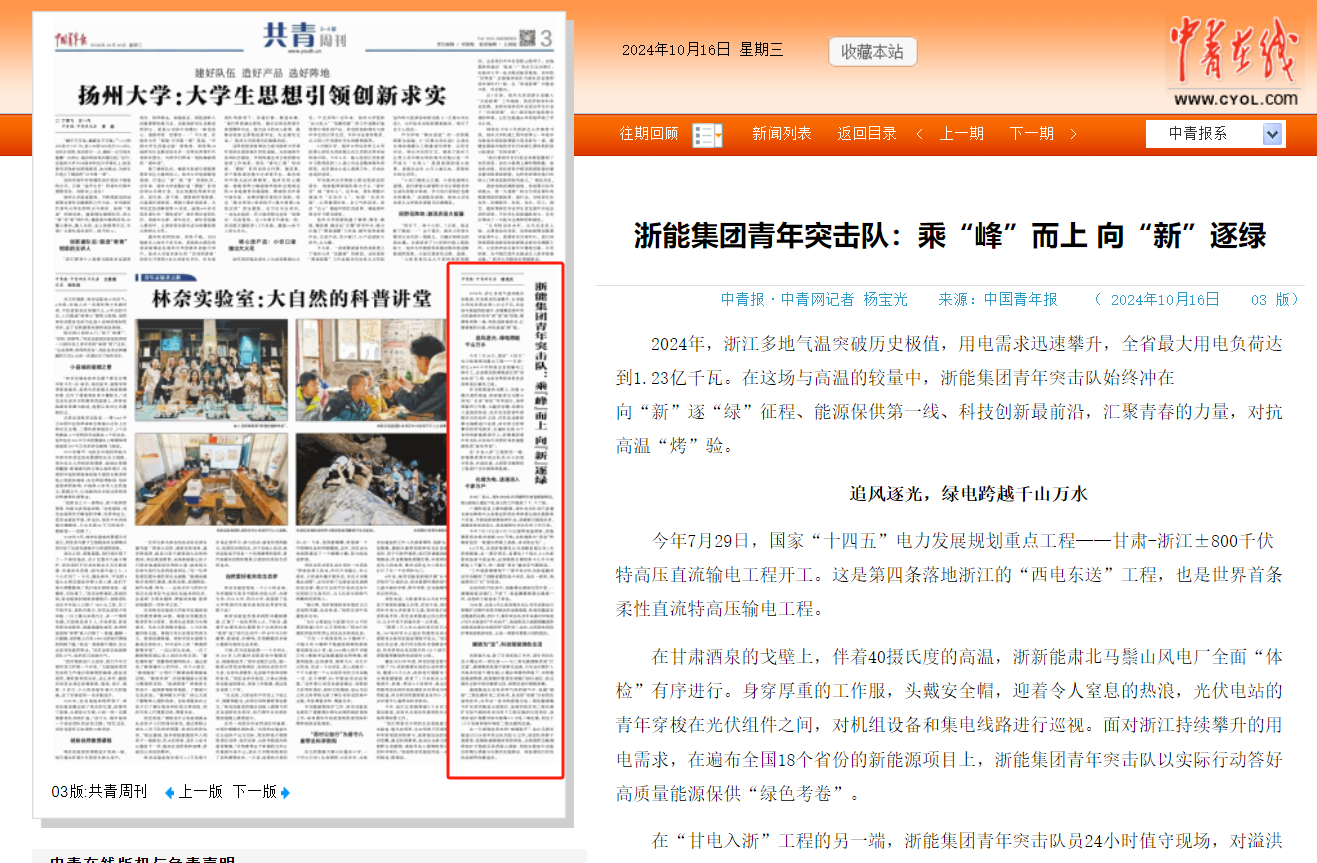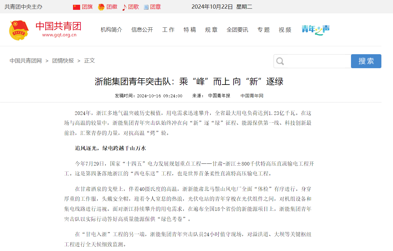 編者按:浙能集團青年突擊隊在2024年浙江多地氣溫突破歷史極值、用電需求迅速攀升的情況下,始終沖在向“新”逐“綠”征程、能源保供第一線、科技創新最前沿,匯聚青春的力量,對抗高溫“烤”驗”。10月16日,中國青年報、共青團中央官網等平臺刊發《浙能集團青年突擊隊:乘“峰”而上 向“新”逐綠》,聚焦浙能青春力量。