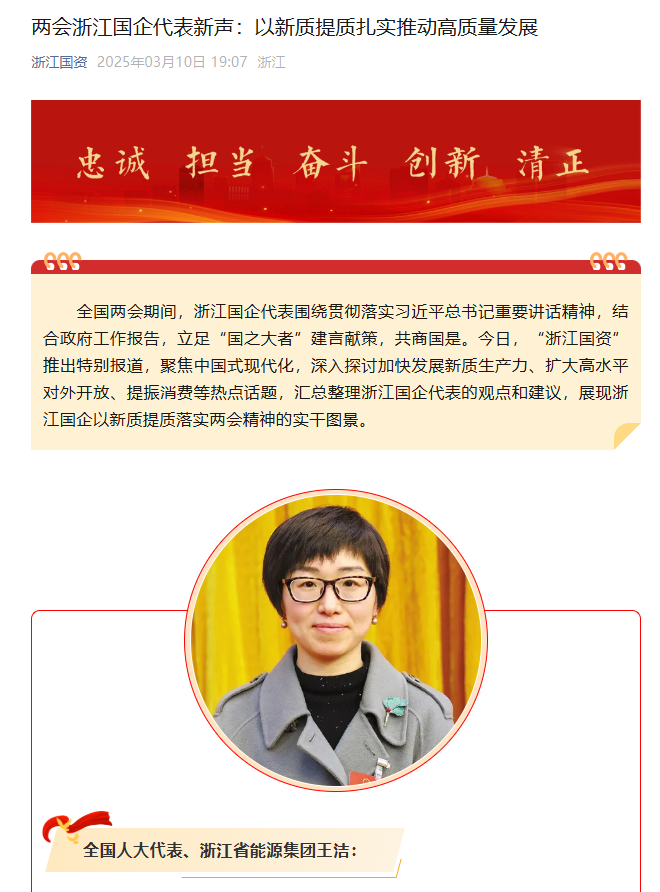 “浙江國資”微信公眾號報道《兩會浙江國企代表新聲:以新質提質扎實推動高質量發展》。 浙江國資 圖