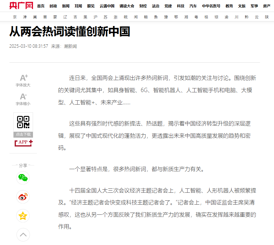 央廣網轉載《從兩會熱詞讀懂創新中國》,聚焦王潔同志。 央廣網 圖