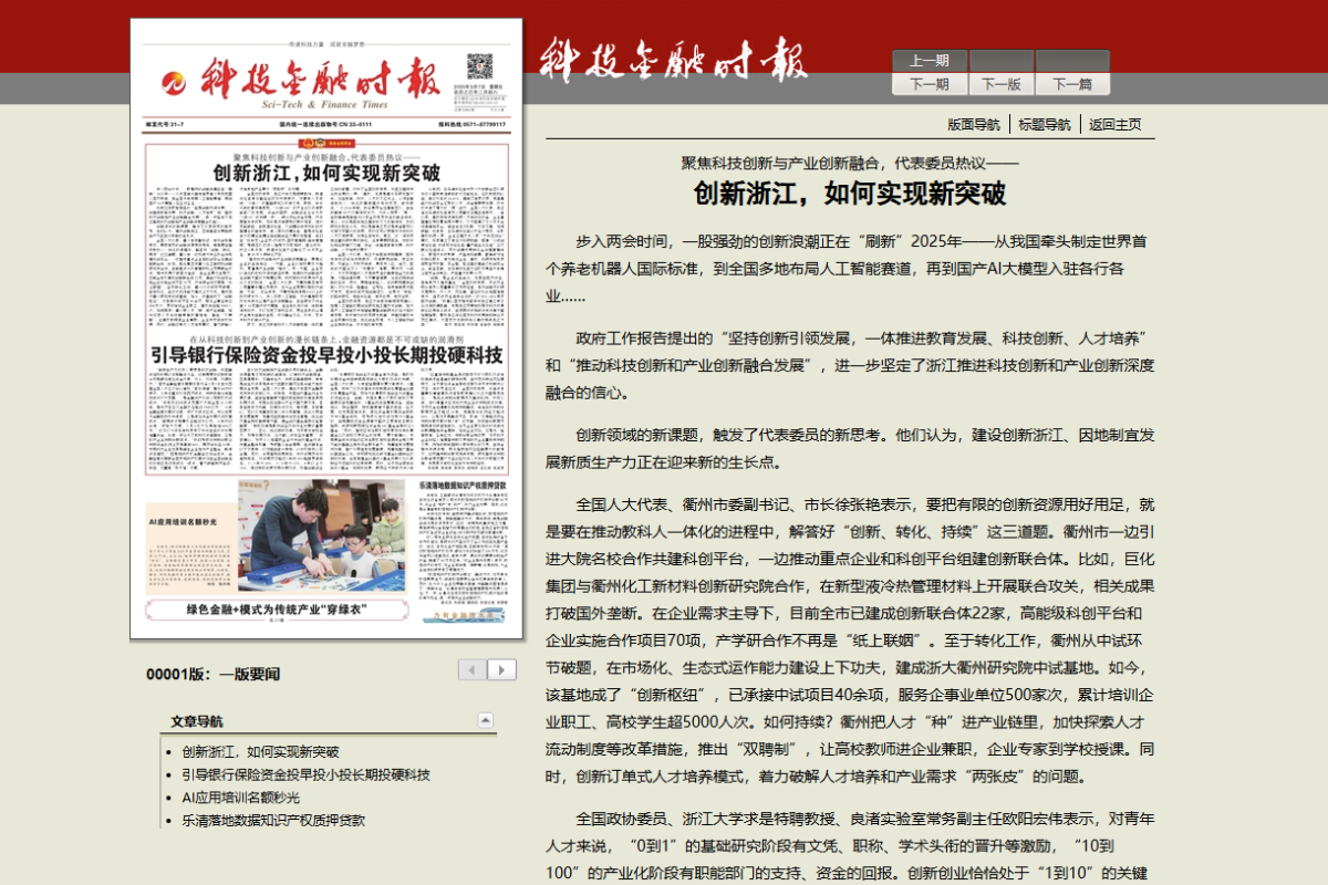 《科技金融時報》報道《聚焦科技創新與產業創新融合,代表委員熱議——創新浙江,如何實現新突破》。 科技金融時報 圖