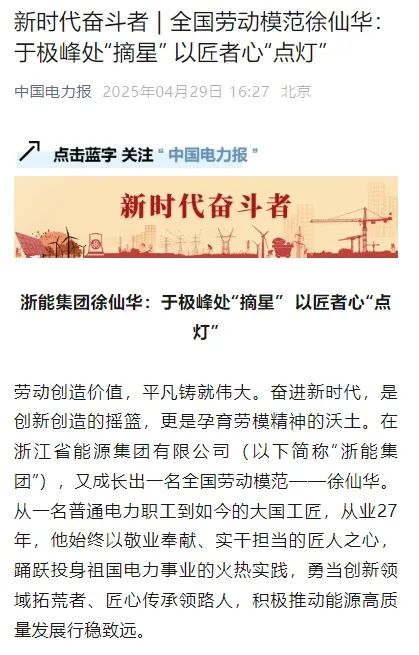 4月29日,人民日報旗下中國能源網報道《全國勞模、浙能集團徐仙華:于極峰中“摘星” 以匠者心點燈》 中國能源網 攝