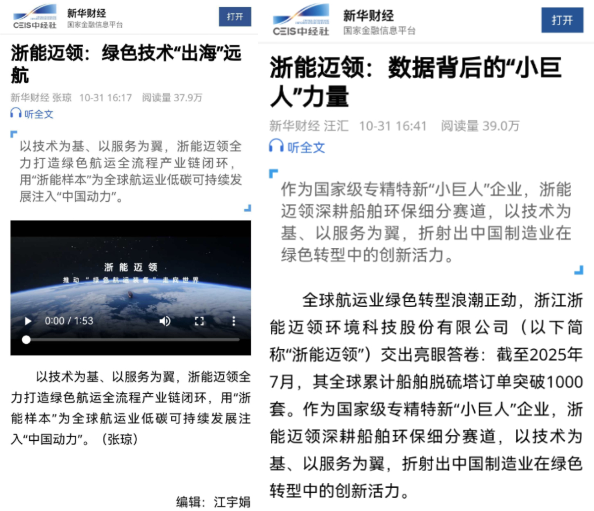 近日,新華社快看視頻號、新華社客戶端、新華財經(jīng)客戶端等平臺聚焦報道浙能邁領(lǐng)以技術(shù)為基、以服務為翼,全力打造綠色航運全流程產(chǎn)業(yè)鏈閉環(huán)的實踐與成就。