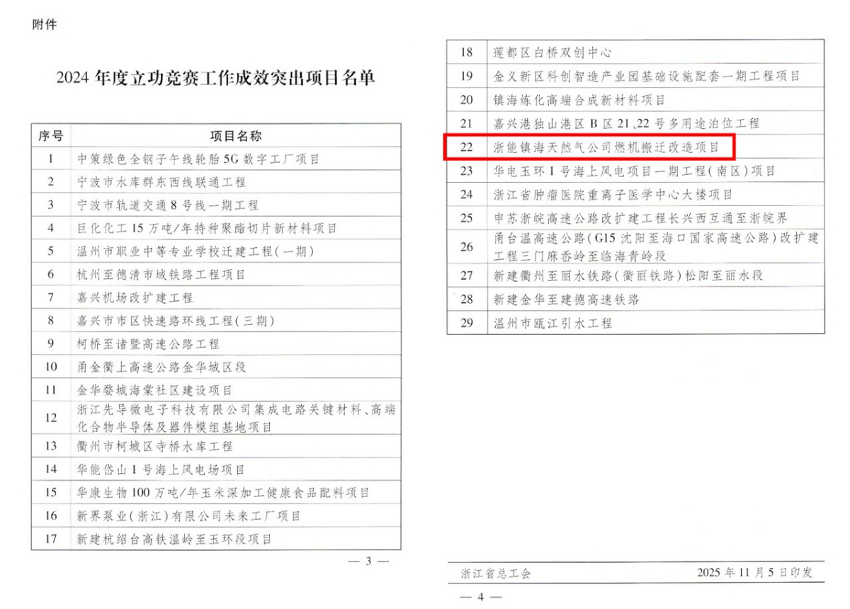 浙能鎮(zhèn)電燃機(jī)搬遷改造項(xiàng)目獲省級立功競賽工作成效突出項(xiàng)目