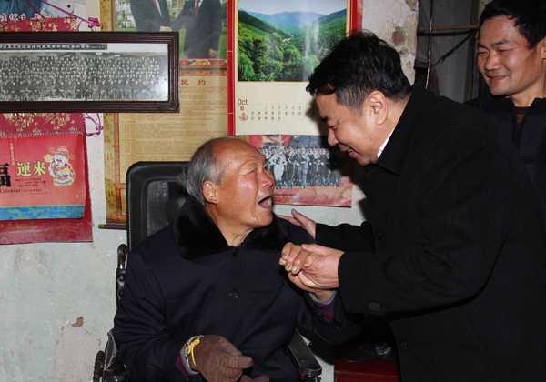 從項艷飛家中出來后,張兆都一行驅車35公里來到長興縣白峴鄉和岕口村嶺上自然村,走訪慰問居住在這里的退休職工章長福。章長福曾獲煤炭部勞模稱號,退休后因患腦溢血,生活不能自理。張兆都一進章長福家門,就握著老章和他老伴的手,噓寒問暖。在老章家簡陋的小屋里,張兆都和老章親切交談。當得知老章年輕時擔任礦井采煤隊長,勇奪高產作貢獻的事跡時,張兆都向老章伸出大拇指,連聲稱贊:“你為長廣的建設發展作出了貢獻,組織上不會忘記。今天,省總工會、浙能集團工會、長廣集團領導都來看望你,希望你生活愉快,安度晚年。”章長福十分激動地說:“領導和組織時常關心、照顧著我,非常感謝。”