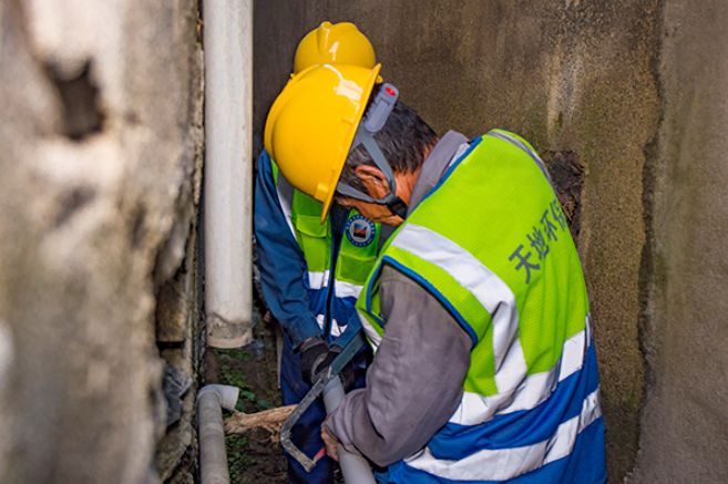▲浙能天地環保公司現場施工人員正在維修村民家污水排放管道。