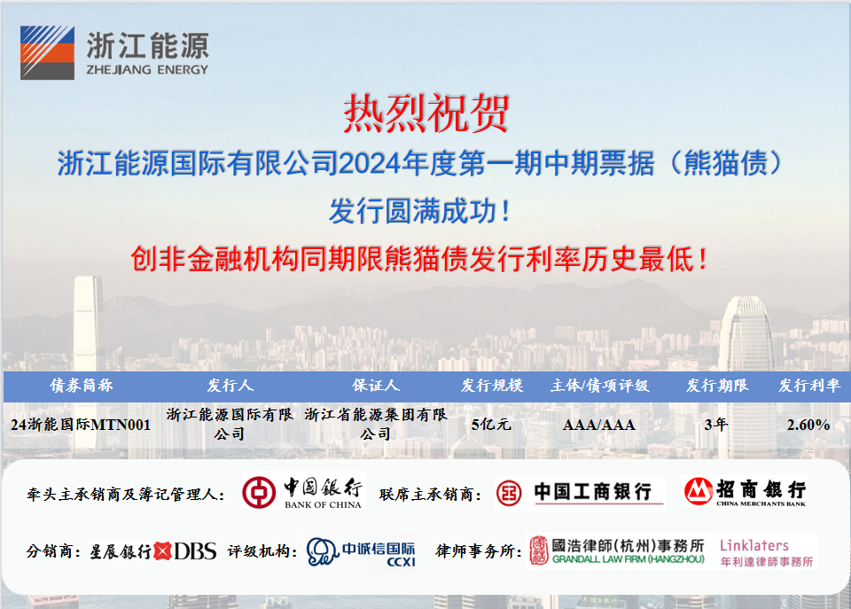 本網訊 3月25日,浙能集團旗下浙江能源國際有限公司在中國境內成功發行浙江省屬國企首單熊貓債。首期熊貓債發行5億元人民幣,期限3年,票面利率2.6%,創非金融機構同期限熊貓債發行利率歷史最低。