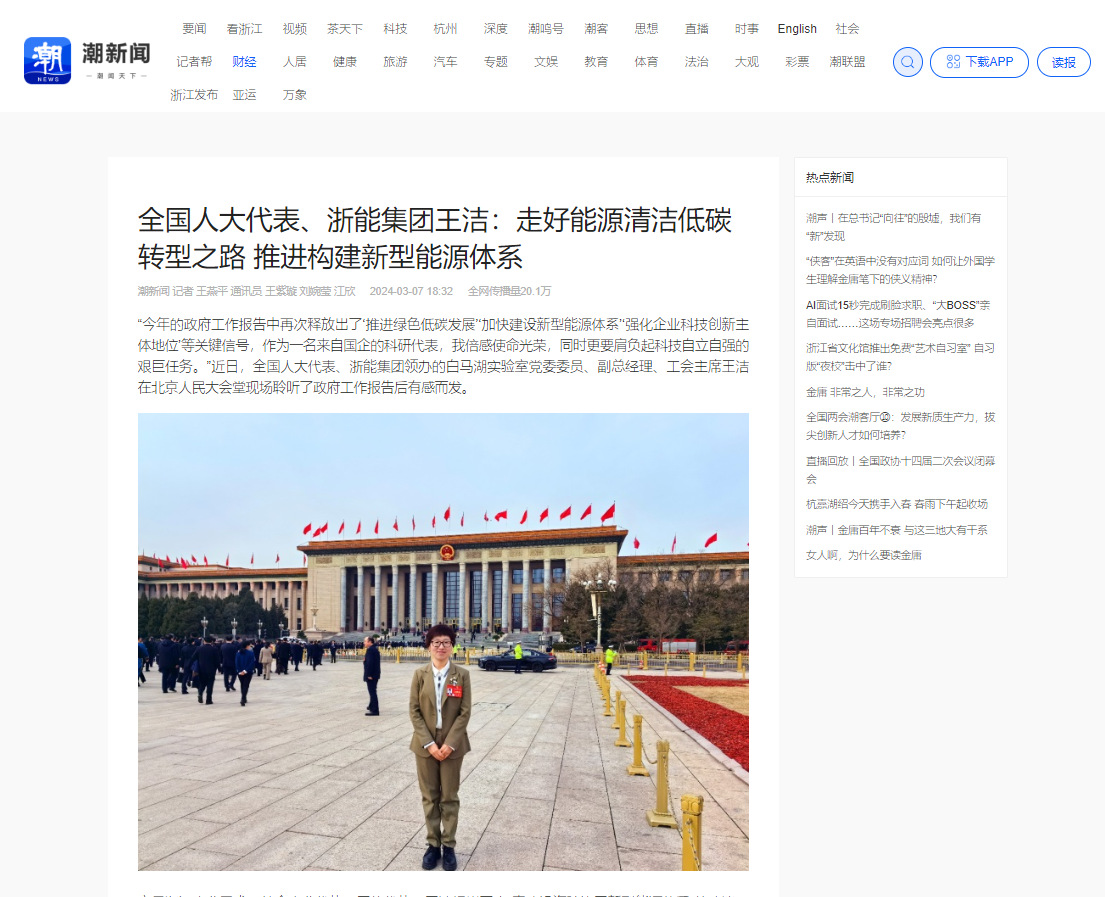 潮新聞客戶端報道《全國人大代表、浙能集團王潔:走好能源清潔低碳轉型之路 推進構建新型能源體系》。 潮新聞客戶端 圖