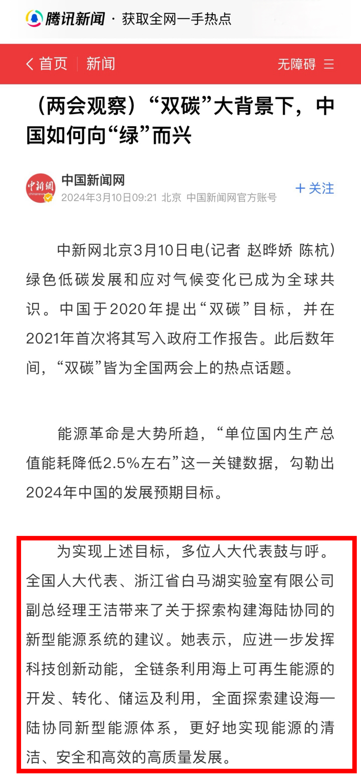 騰訊網報道《(兩會觀察)“雙碳”大背景下,中國如何向“綠”而興》 騰訊網 圖